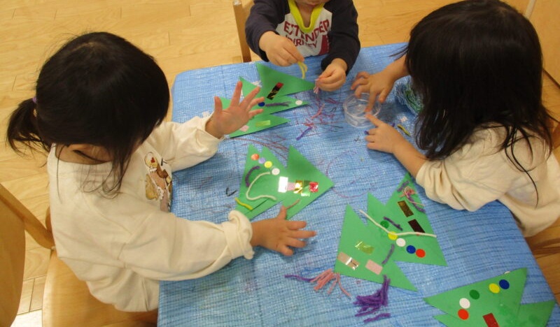 今日は、みんなでツリーをつくるよ!三角をくっつけたら、木ができたね。