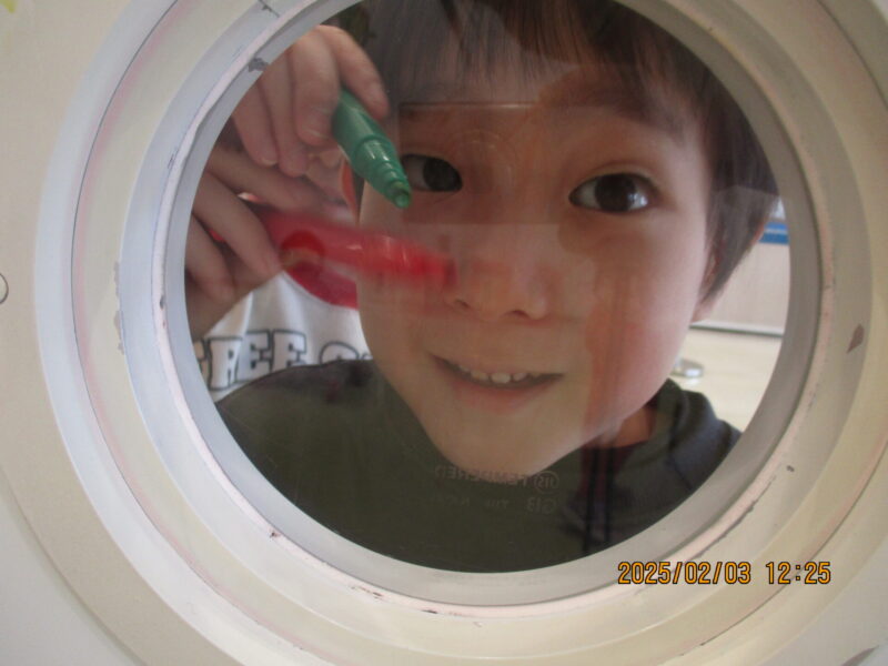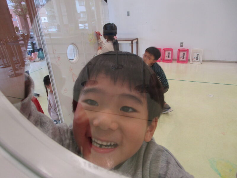 食後はホワイトアトリエで普段はなかなかできない壁や床にお絵描きを楽しみました。