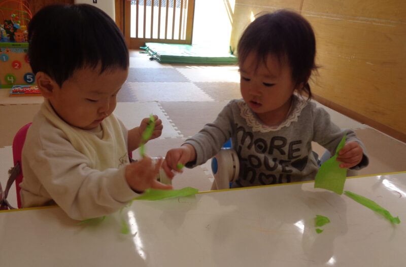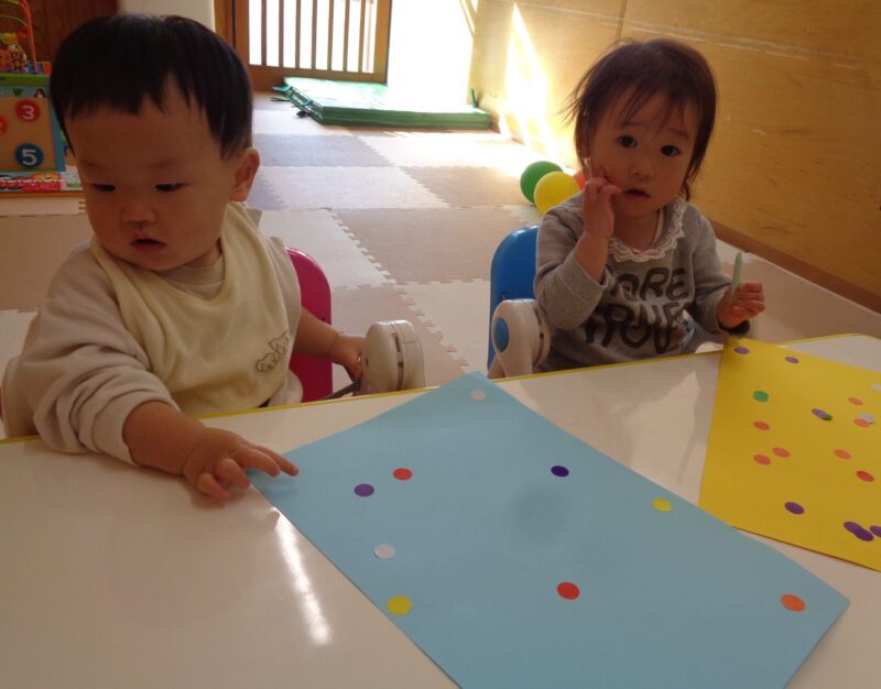 数カ月前までは保育士に少し手伝ってもらいながらしていましたが、今では自分でしっかり貼れる子が増えています👏