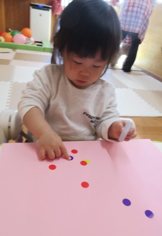 シールを保育士にもらうとペタン!ペタン!と次から次へと夢中になって貼ってくれます👀