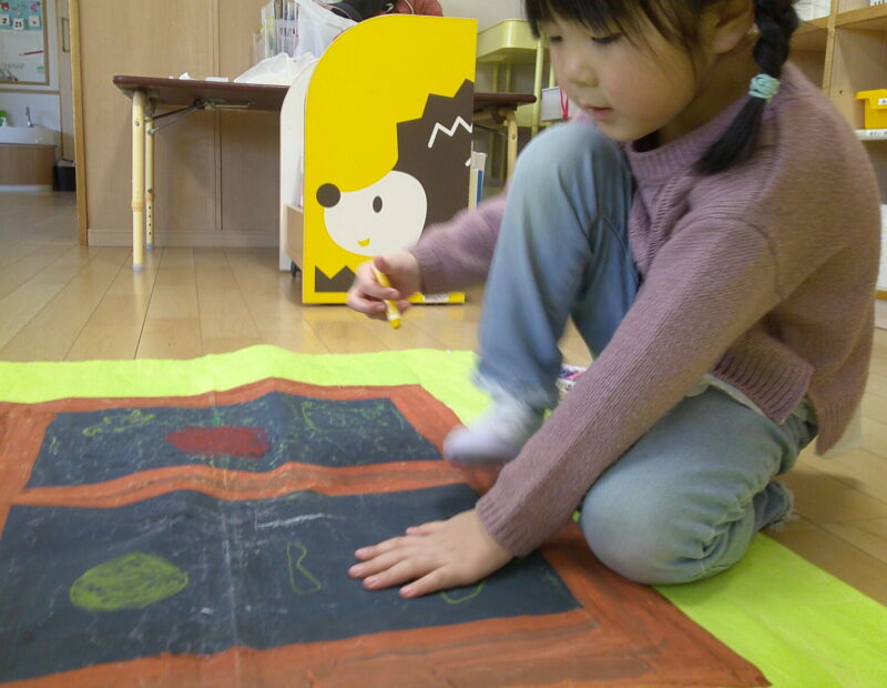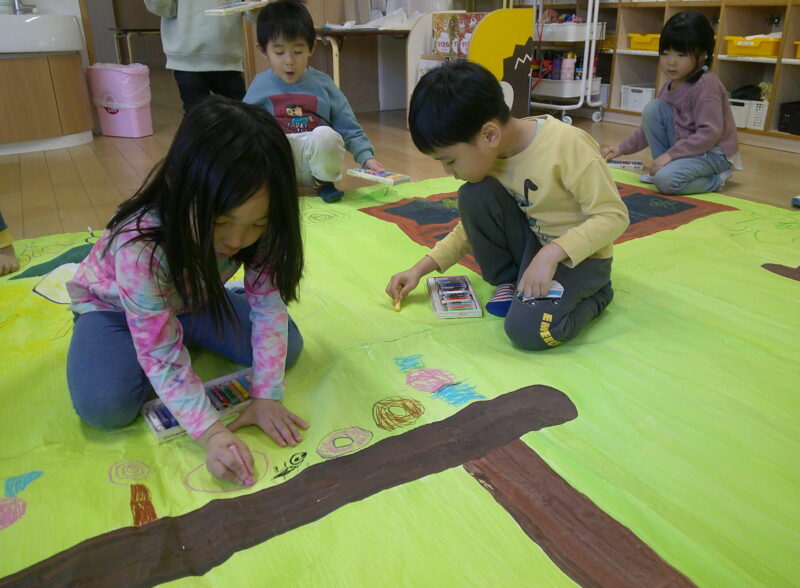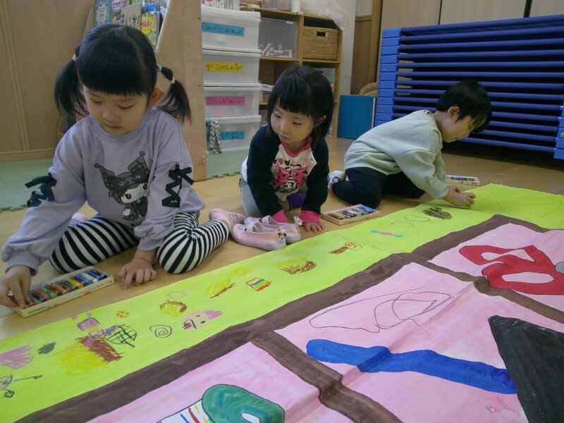 「えーこれに描いていいの??」「おっきい紙に描くの楽しそう♫」クレヨンを持って夢中で描き足していくつき組さん🎵