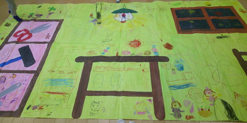 発表会「こびとのくつや」で使用した背景画に、子ども達が好きな絵を描き足して遊びました。
