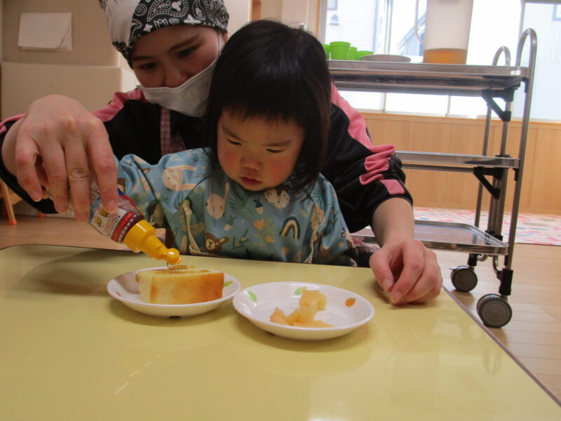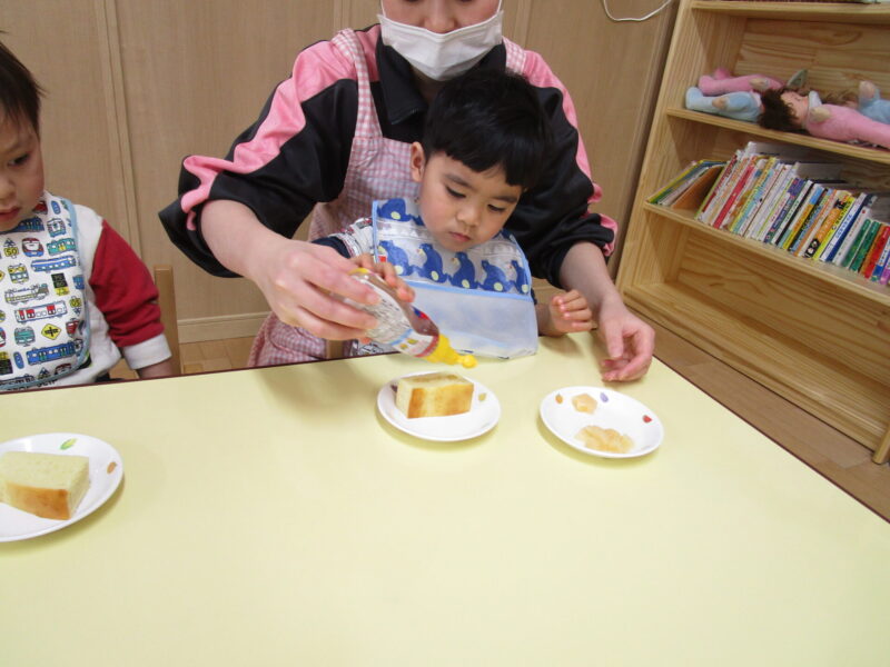 みんなで給食の先生からお話を聞き、ホットケーキにシロップをかけることから始めました。