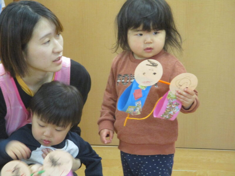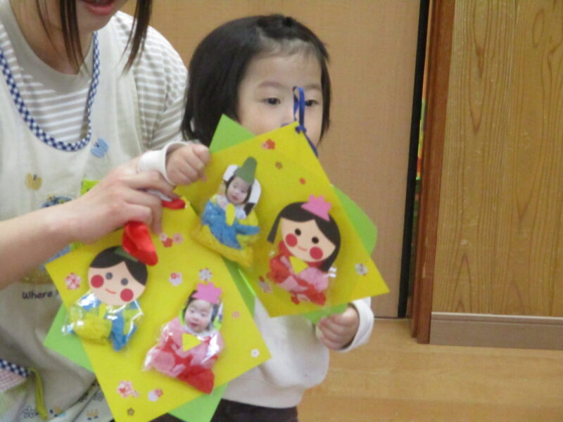 「おひなさまとおだいりさまは何をしているのー?」と尋ねられると「座ってる!」「集いをしてる!」という面白い答えが返ってきました♬