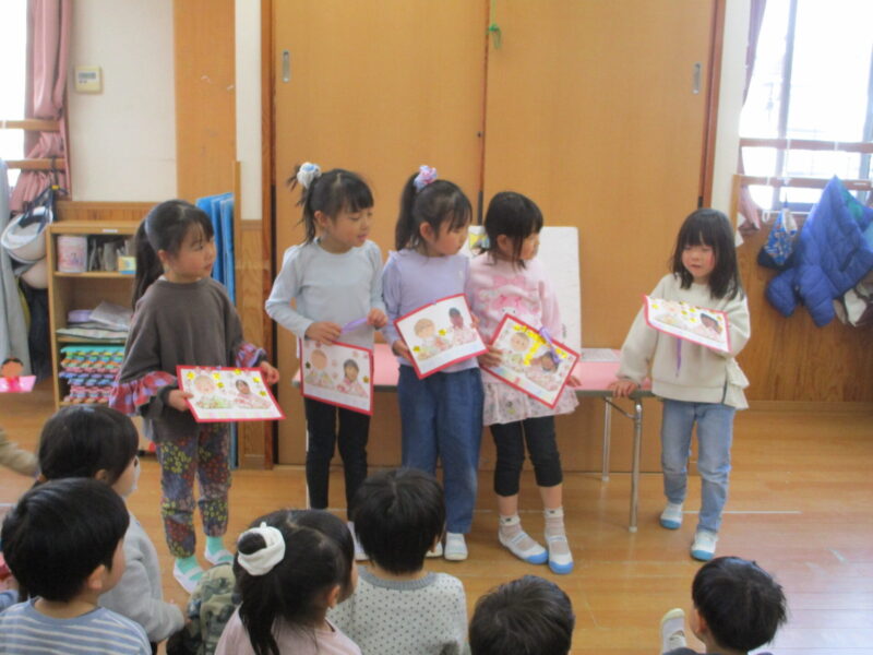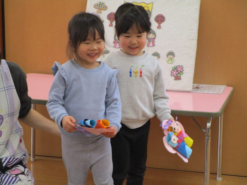 作品紹介ではとても可愛いひな祭りの製作を皆に披露していました。見ているお友達も「可愛い!」「素敵!」と褒めていました