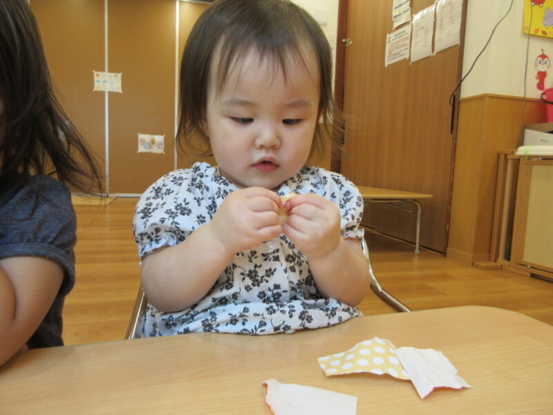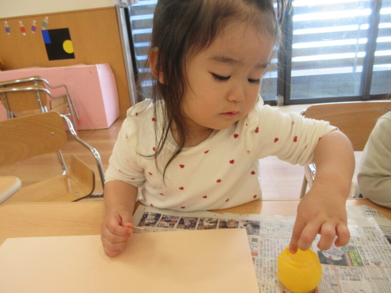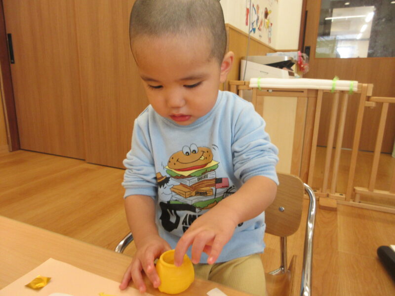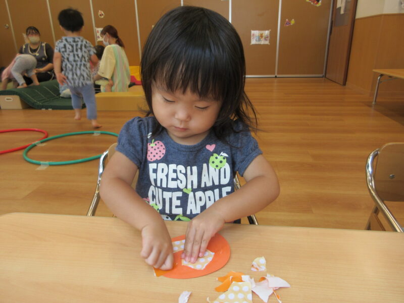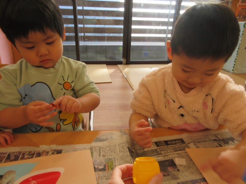 指先が器用になってきて折り紙をちぎったり、優しくスタンプをしたり、色を塗ったり、とても上手に制作を楽しんで行っていました♪
