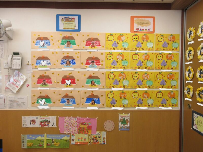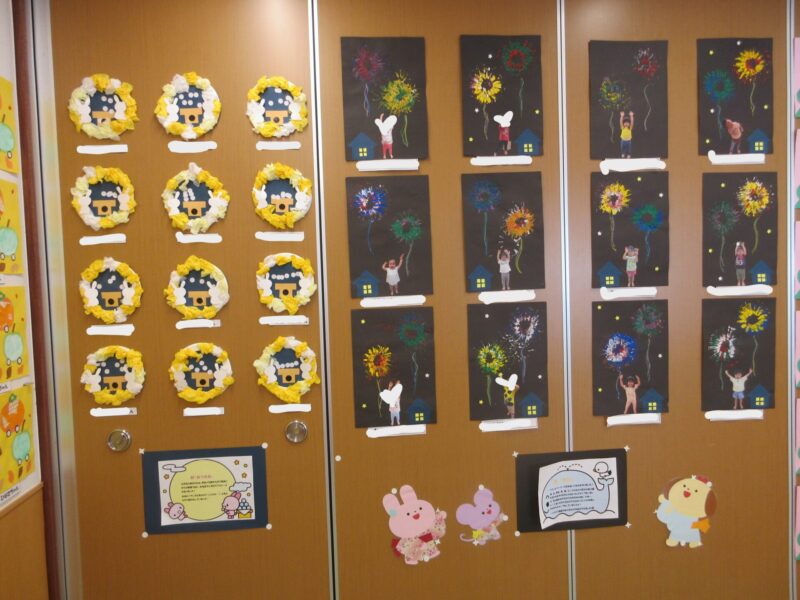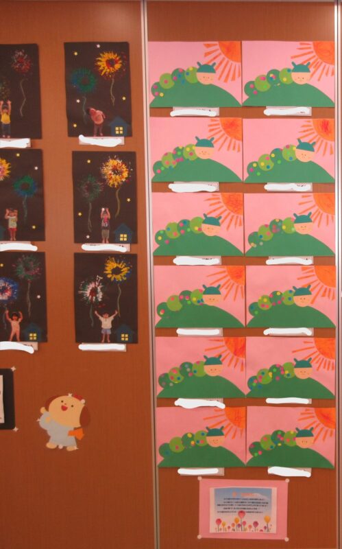 最後に、発表会で「どんないろがすき」を披露したので作品展には色を使ったものを沢山作りました🖍 みんなの手形(虹)や折り紙を折ってちょうちょ・チューリップを作ったり、自分の好きな色で塗り絵をしたり・・と沢山の色を使いました☆ 保育者が写っていますが・・・😅