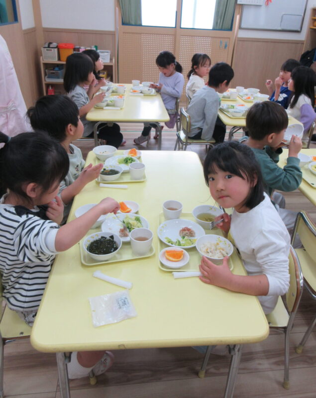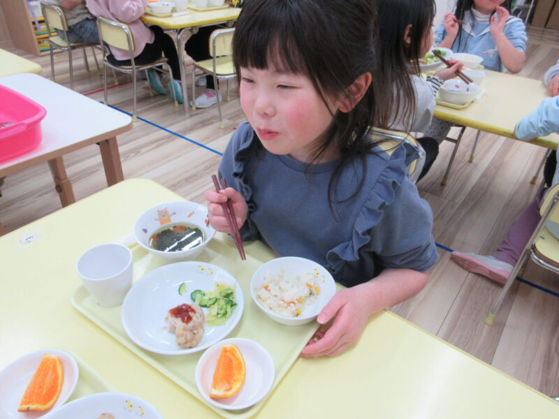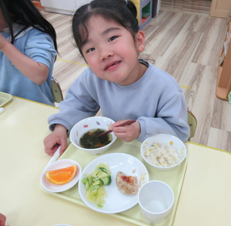 ハートを崩すのがもったいないようで、大切に食べていた子どもたち。最後はみんなでほぼ完食です。みんなで喜びを共感しながら食を楽しむのも大切な食育だと考えております。今回のようなサプライズがきっかけで、苦手なものも少し食べてみる、それが美味しいと感じるなどのきっかけにもつながっていきます。栄養士の先生、手作りハートのハンバーグサプライズ、ありがとうございました♪ 今後も栄養士の先生と「食を楽しむ」を意識しながら、食育を進めていきたいと思います。