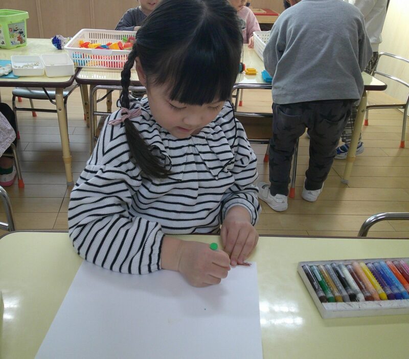 次にお花の葉っぱと茎をクレヨンで描きます。