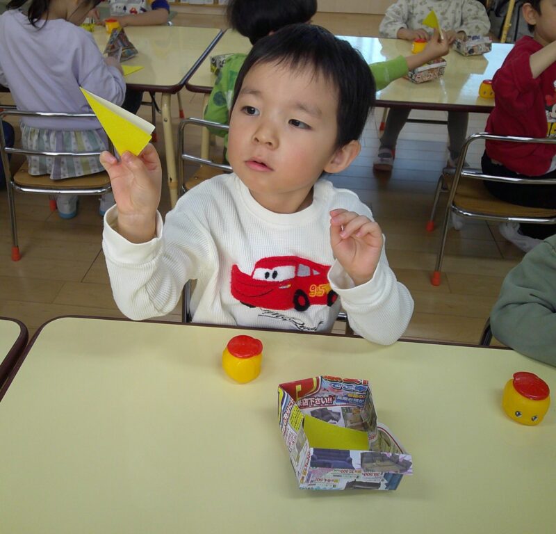 いつもより小さい折り紙を三角折りにしています。