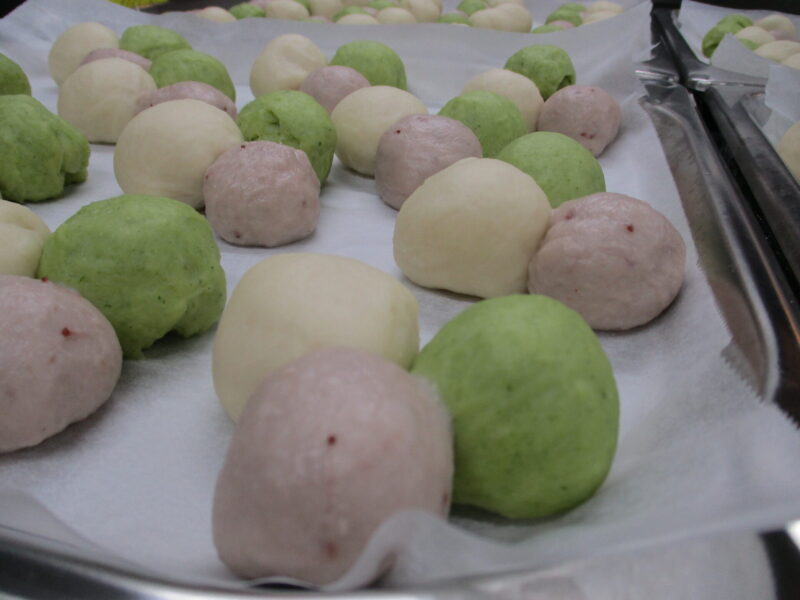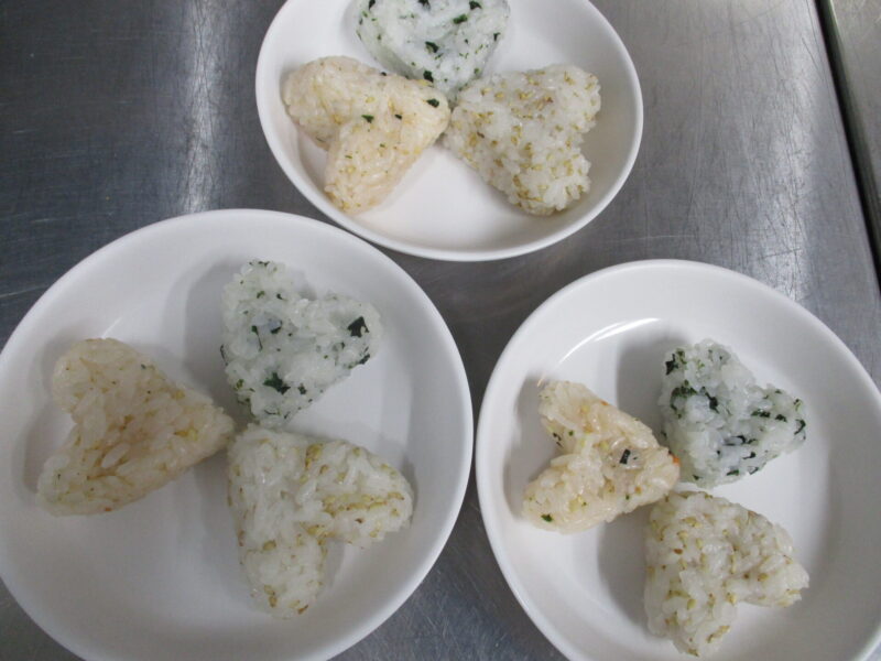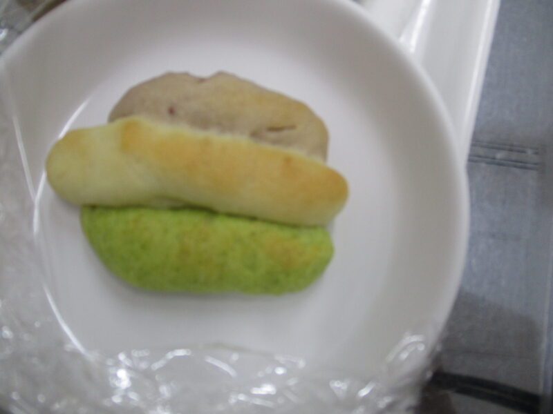 おやつは菱餅ふうな三色ぱんと三色おむすび、手で持って食べられるスティック三色パンが準備されました。