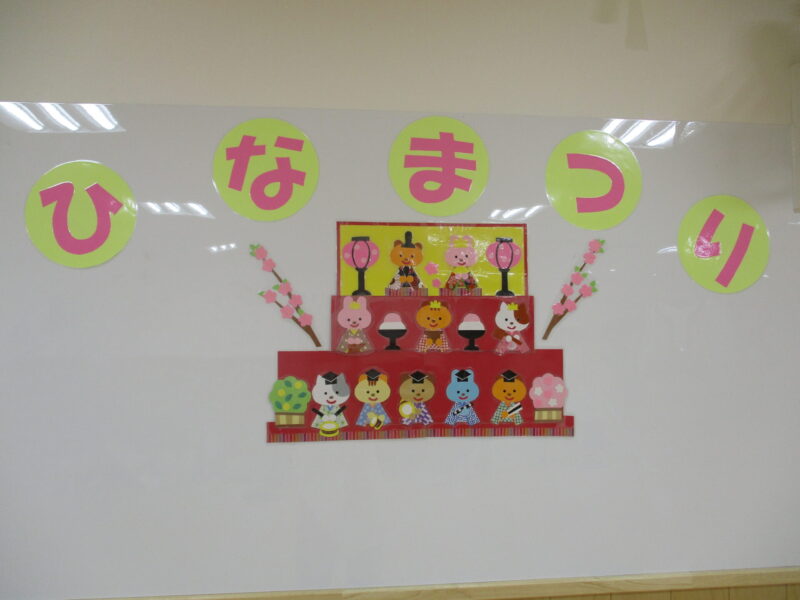 3月3日はひな祭り ホールにはお内裏様も飾られ、ホワイトボードには動物のお雛様が貼られました。