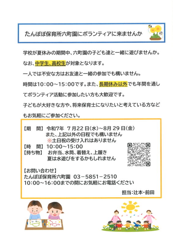当園では子どもが大好きな学生もみなさん、将来保育士になりたいと思っている方々のボランティアを受け付けております。夏休みや長期休みに子ども達と遊ぶ体験をしませんか。もちろん4月より、年間通して受け入れしておりますので、お気軽にお問い合わせください。