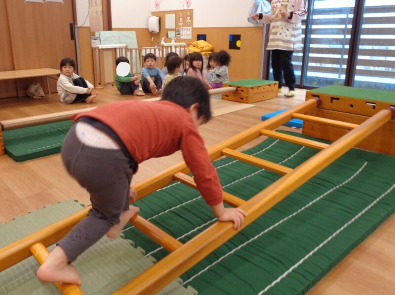 まずは、はしごに挑戦!手と足を交互に動かして器用に渡っています👏