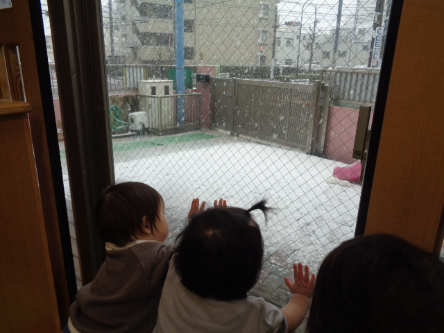何だかいつもより寒いね~…と話していたら、外の景色がだんだんと雪景色に!子ども達も不思議そうに窓から眺めています。