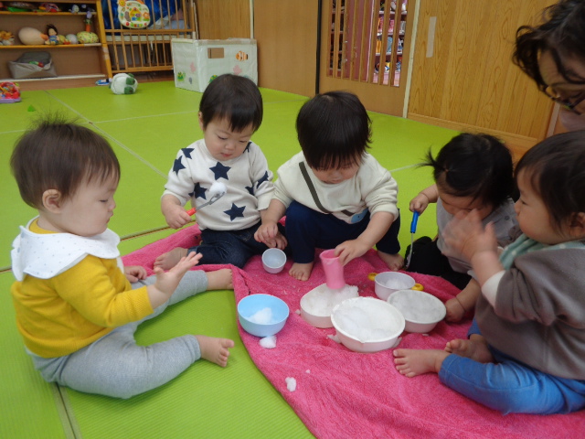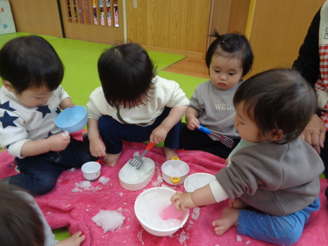 触って遊んでみよう!ということで、お皿に雪を乗せて暖かいお部屋で雪に触れてみましたよ♪