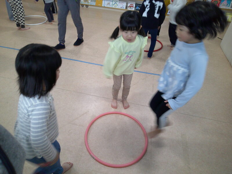 その後は3人組で順番にフラフープの中に入る競争をしたり