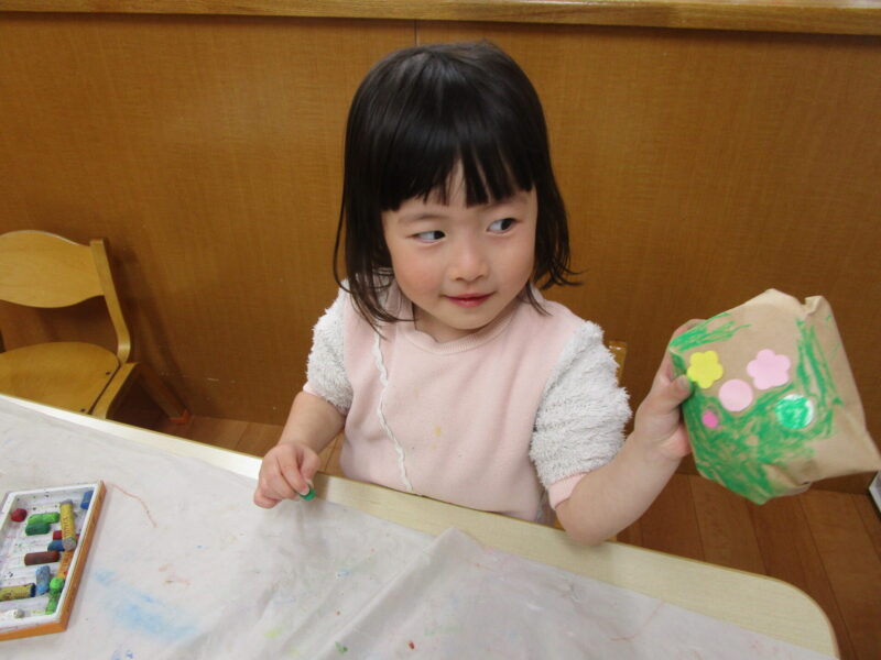 自分達でパンにクレヨンで色を付けたり、お花や丸の画用紙を貼ってトッピングしました。