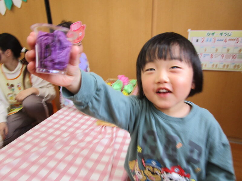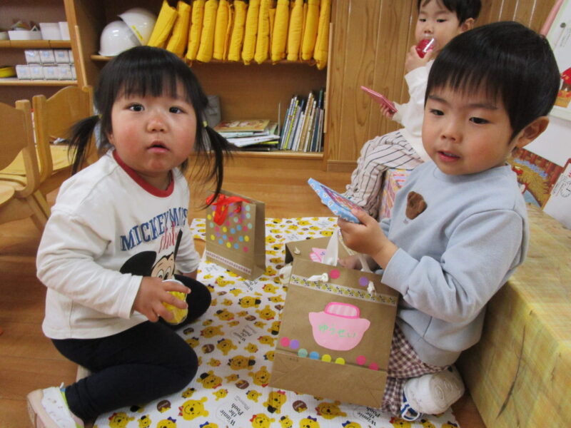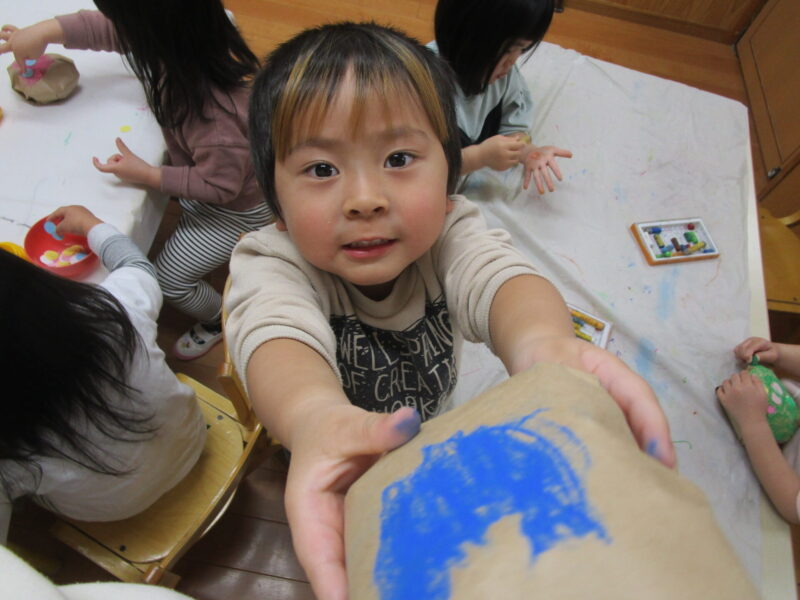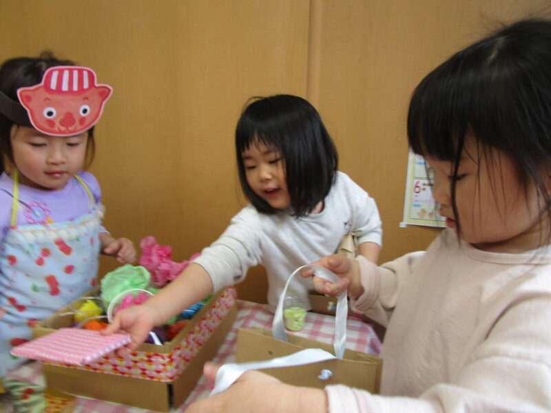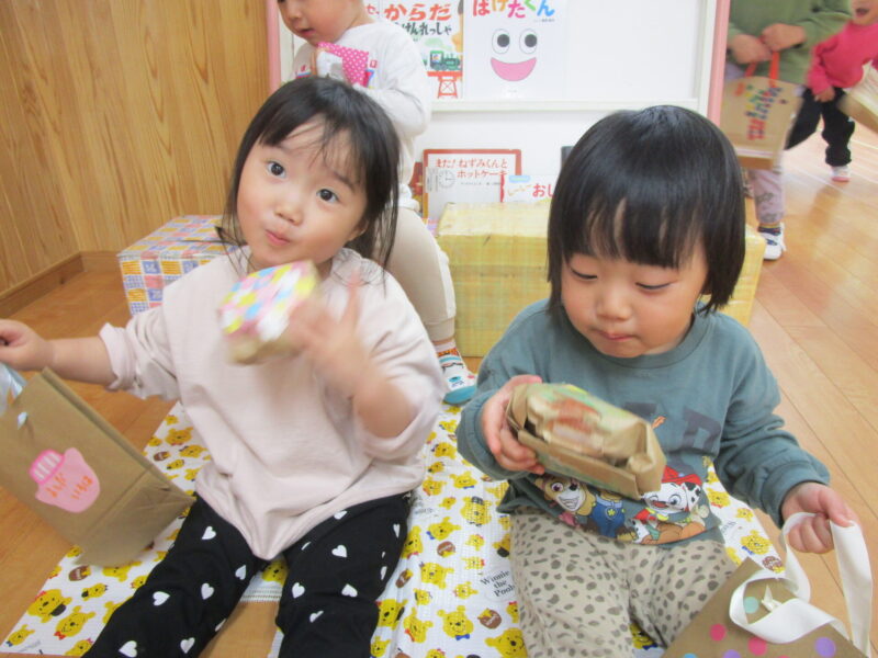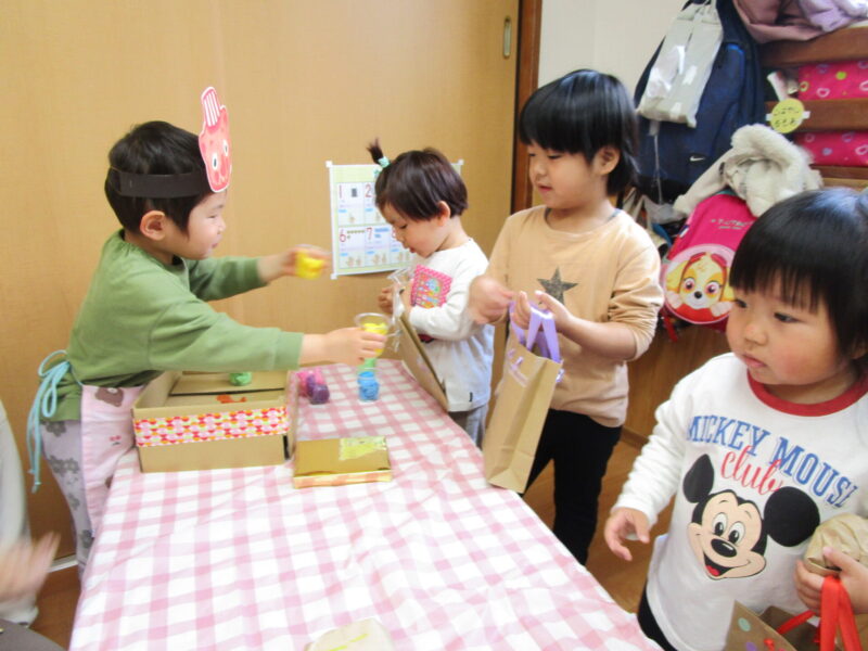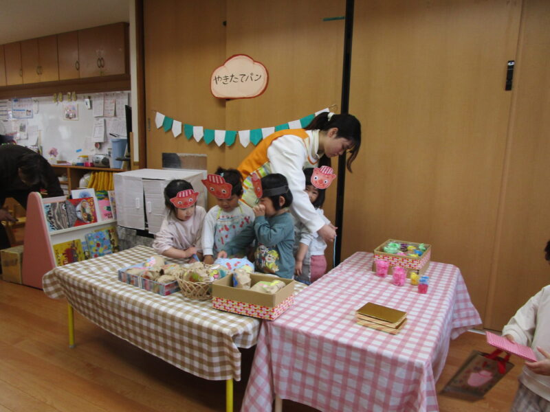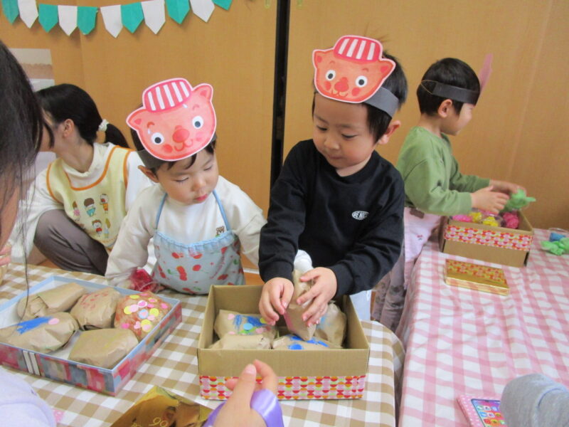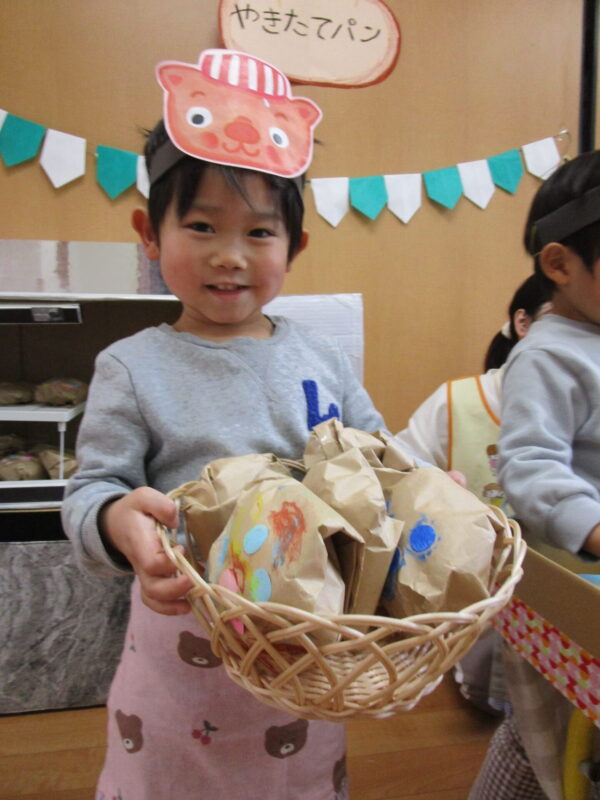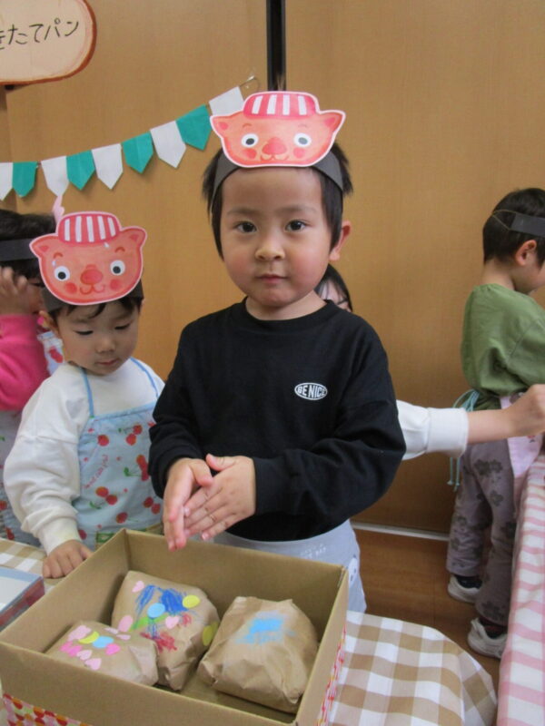 何味ですか?という質問には「お魚パンです!」や「タマゴ味のジュースだよ」などと個性的な商品の揃う楽しいお店でしたよ。最後はお土産に好きなパンを一つずつ持って帰り、次の日には「お家でもパン屋さんした!」と教えてくれる子がたくさんいました。たのしかったね!