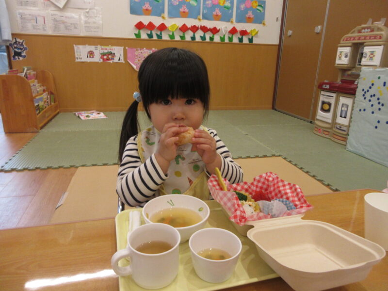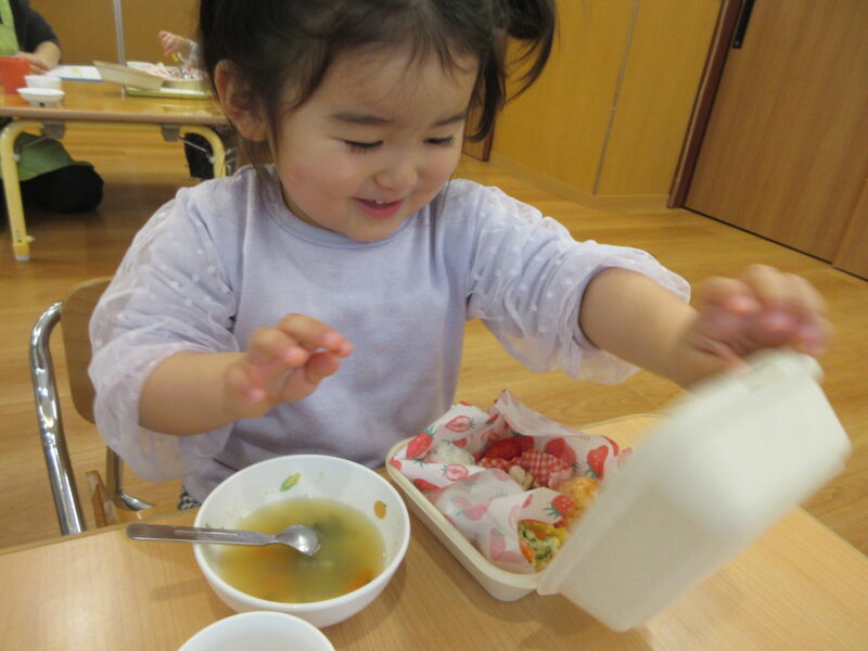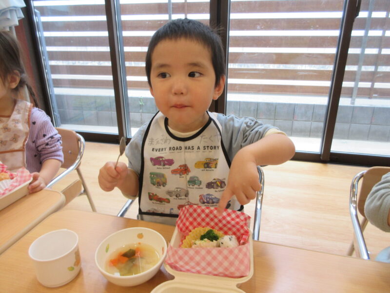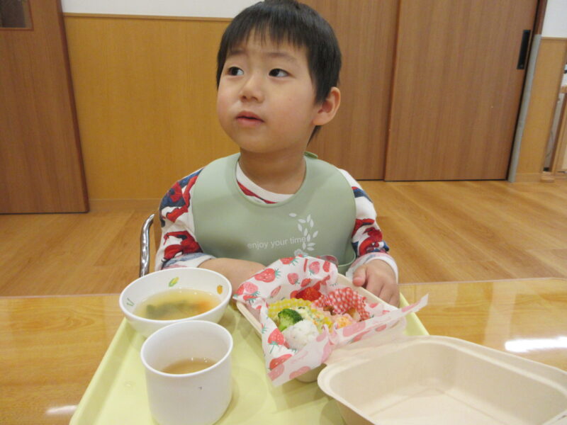 先生から今日はお楽しみ給食でお弁当になっていることを聞き「おべんとう!!」と目を輝かせてワクワクです👀✨