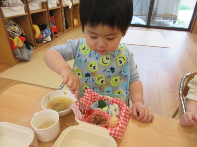 先生から今日はお楽しみ給食でお弁当になっていることを聞き「おべんとう!!」と目を輝かせてワクワクです👀✨