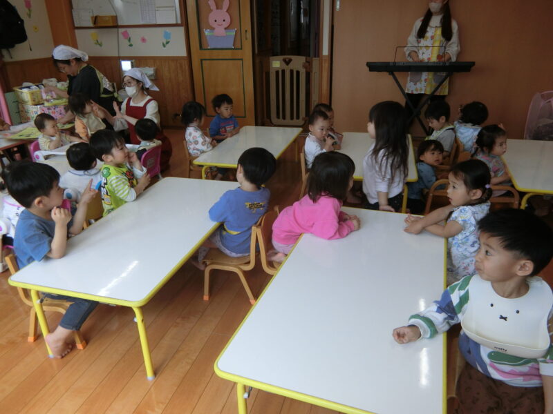ひよこ組、うさぎ組、きりん組の全クラスが合同で給食を食べるのは今日が最初で最後ということもあり、きりん組さんは朝から給食の時間が楽しみでワクワク😆✨