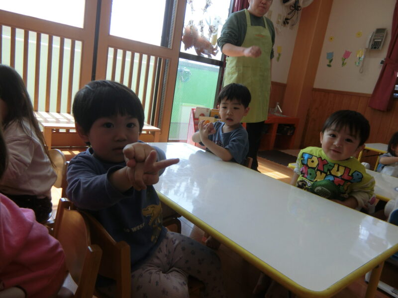まずはきりん組さんから「グーチョキパーでなにつくろう」の手遊びを発表しました✋