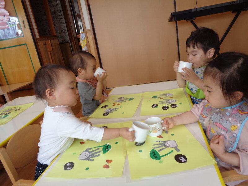 皆でお給食の歌を歌っていただきますをしたら、「かんぱーい!🥂」