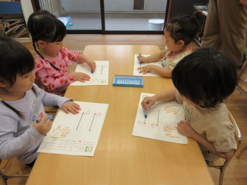 次にみんなのクレヨンが配られて、一人ずつ持ってみました!「ペンってこーやって持つんだよね!」とお友達と確認しています!