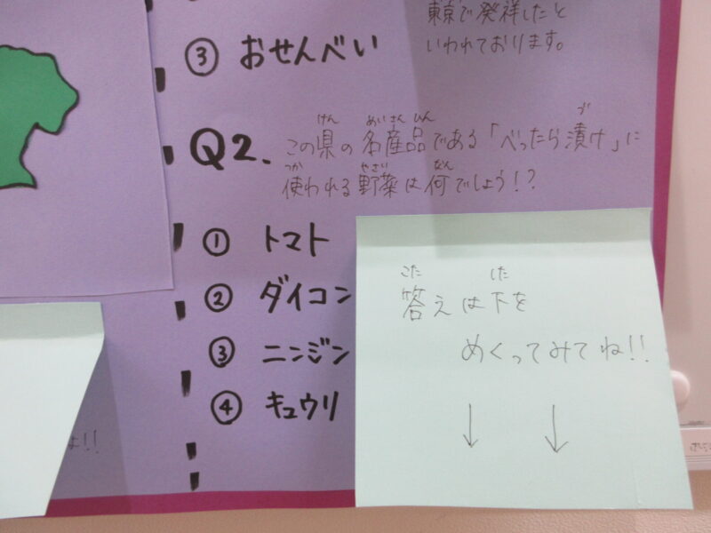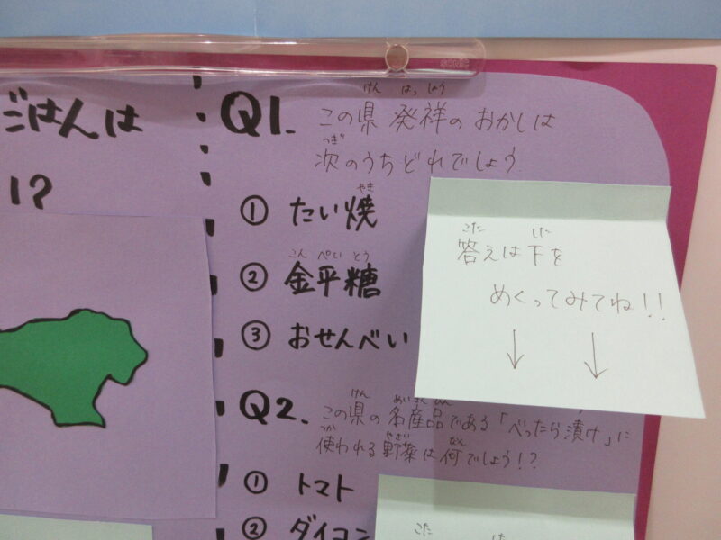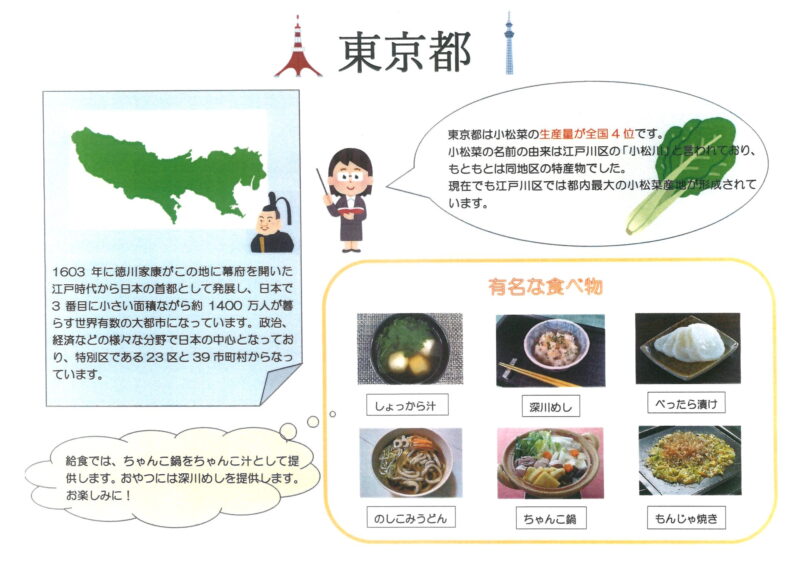 当園では、全国のご当地メニューを子ども達にも知ってもらい、食への興味に繋がり、みんなで楽しく話題にしながら食事が出来ると嬉しいと思い、栄養士の先生が毎月ご当地クイズを掲示してくれます。幼児組には大人気のコーナーです!今月のご当地給食・おやつは「東京」です。