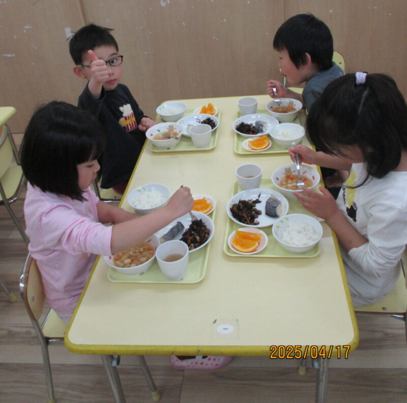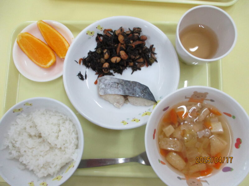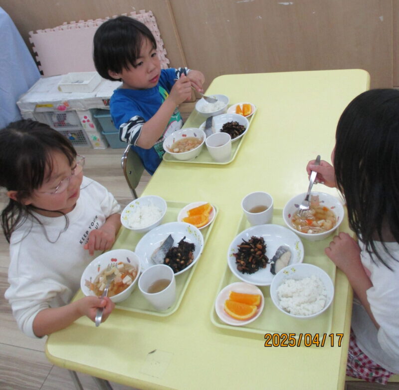4月のご当地給食メニューは「さわらの塩焼き・ちゃんこ汁・ひじきの煮物・果物」です。保育者がどの東京のごはんが美味しいか聞くと、「ちゃんこ汁と鰆の塩焼き」が大人気でした。おやつは「深川めし」です。