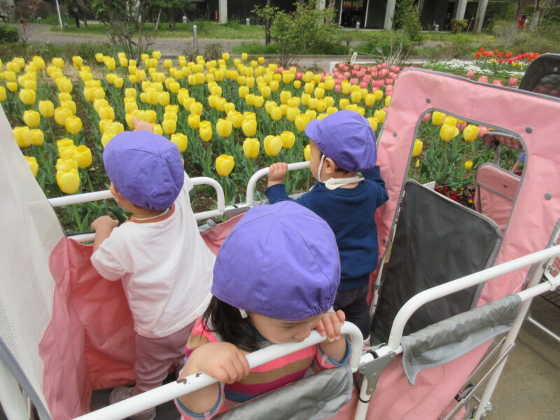お散歩にも行くようになりチューリップ🌷を見たり電車見学に行ったりして、楽しんでいます🚃💨