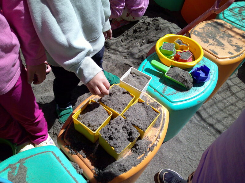 砂場でお店屋さんごっこが始まりました。クッキー・ケーキを売っているお店です。