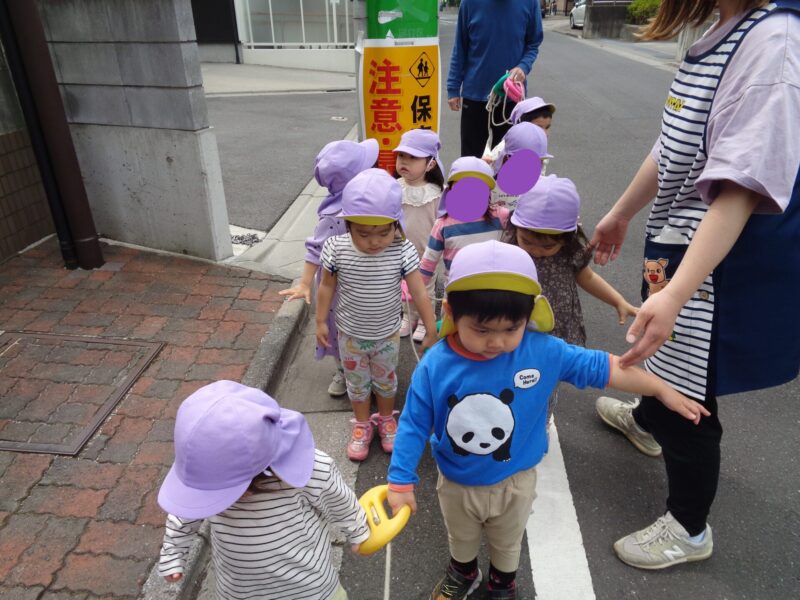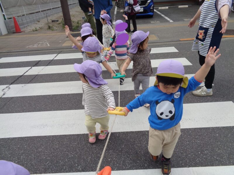 そこで、すみれ組さんではお散歩ロープを使って散歩することに挑戦してみました!