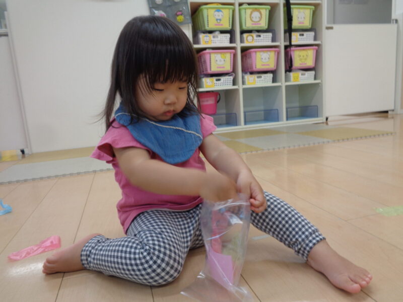 たくさんあそんだ後は、袋にたくさん入れられるかな~?と袋詰め遊びも楽しみましたよ♪