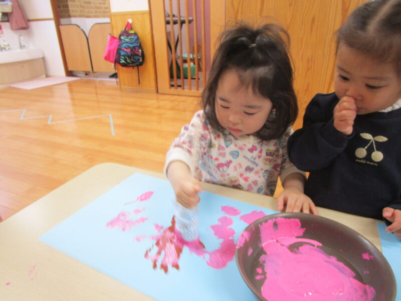 ピンクの絵の具を使ってスタンプ!!