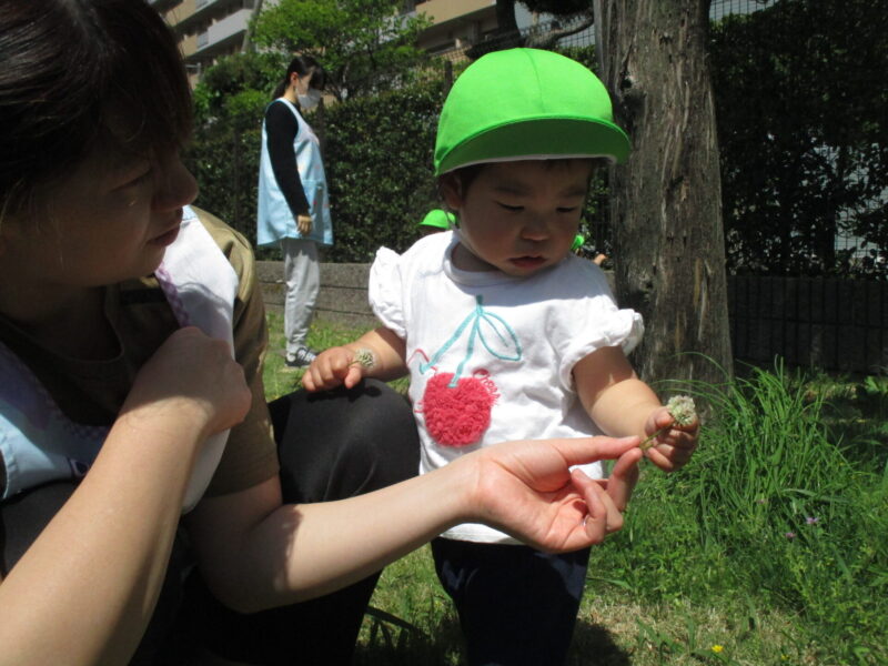 色々な草花に興味持ち、友だちや保育者と一緒に草花を摘み取って観察するだけでなく匂いをかいだり、ちぎったりして遊んでいます。