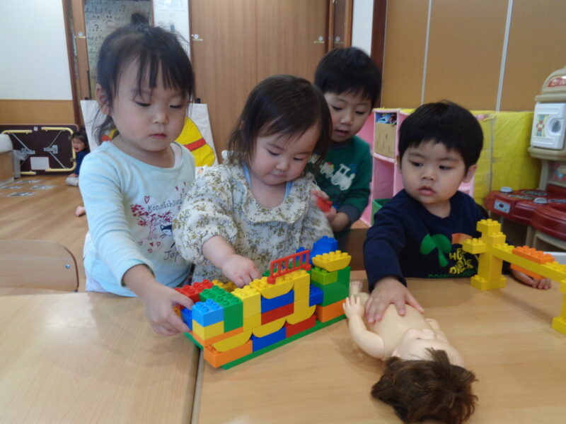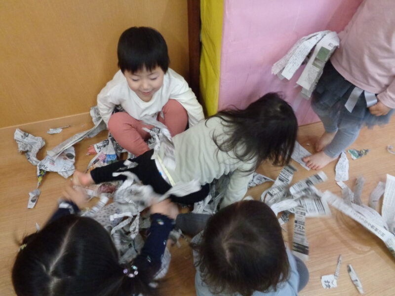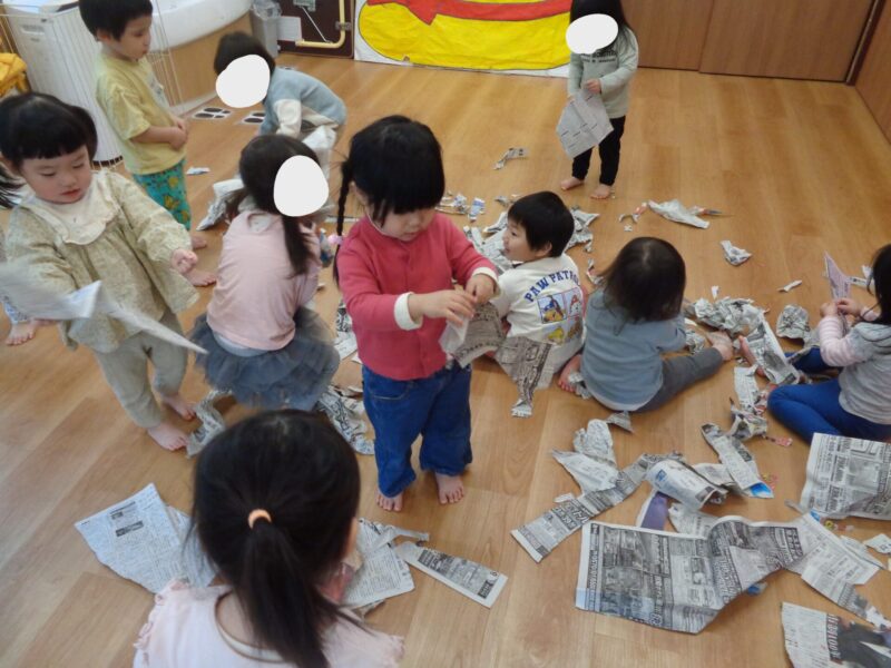室内遊びでは新聞紙遊びをしたり、ブロック遊びをしたりして遊んでいます😊💓