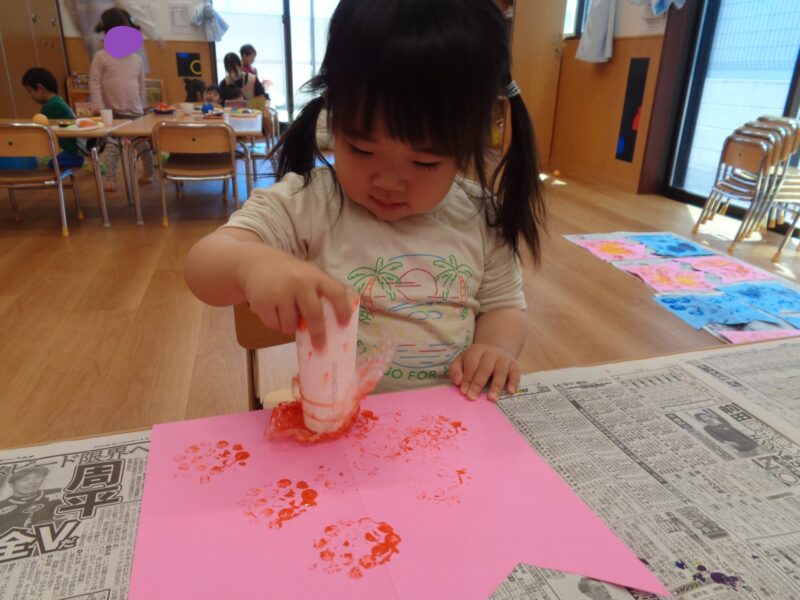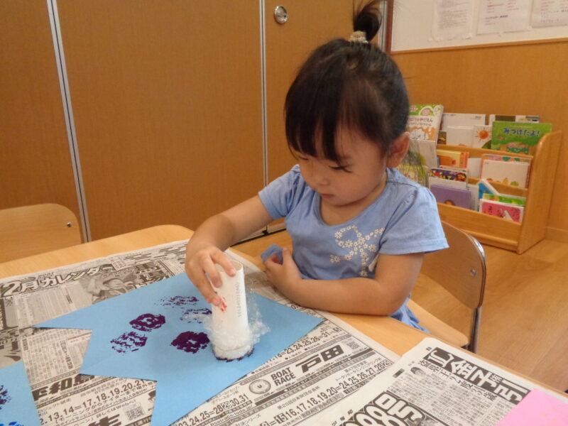 トイレットペーパーの芯に気泡緩衝材を巻き付け、絵の具をつけてスタンプ遊びを行ないました😊