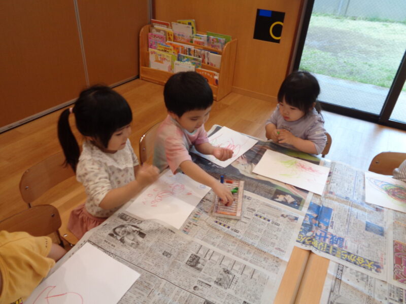 まずは、白い画用紙に好きな色のクレヨンでなぐり描きをしましたよ♬