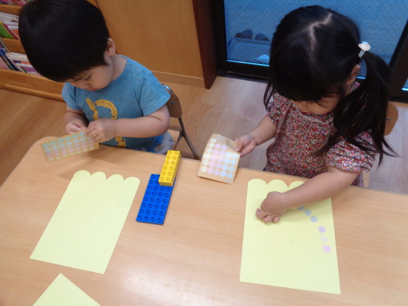 一列に並べてみたり、バラバラに貼ってみたりと楽しそうにしていました💞