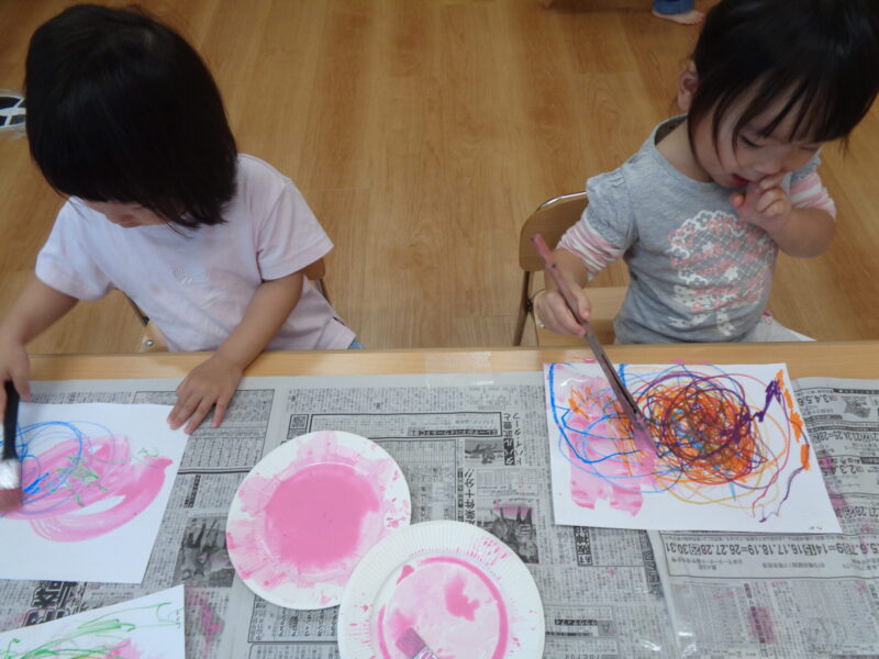 なぐり描きした画用紙にピンク色の絵の具をぬりぬり🎨✨
