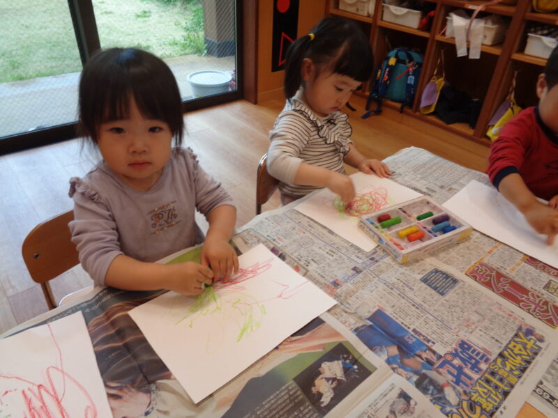 まずは、白い画用紙に好きな色のクレヨンでなぐり描きをしましたよ♬
