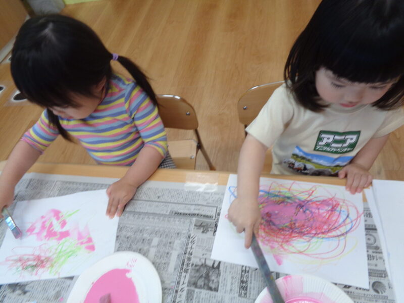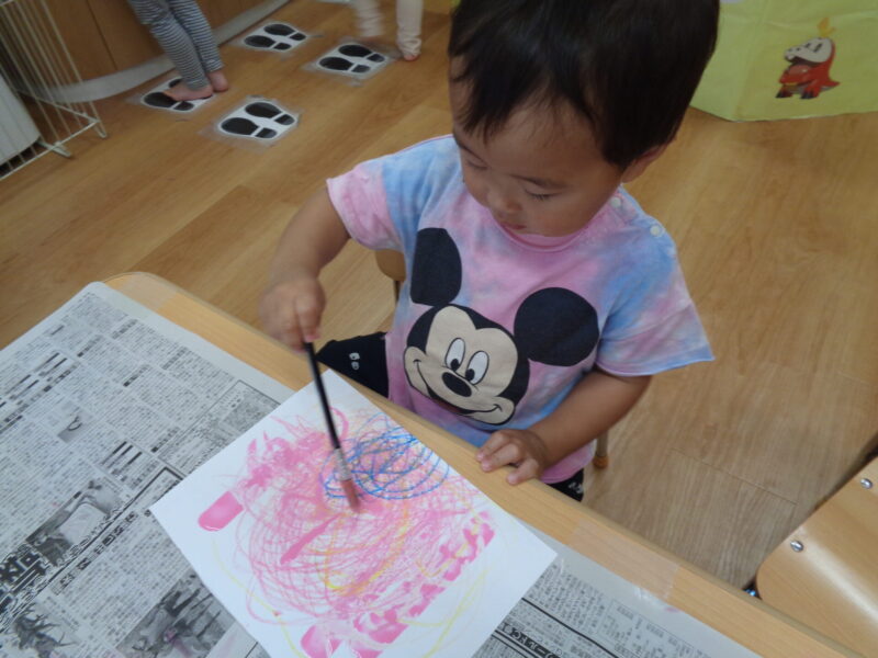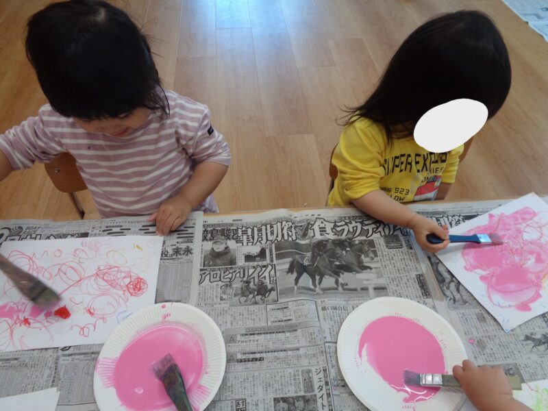 なぐり描きした画用紙にピンク色の絵の具をぬりぬり🎨✨