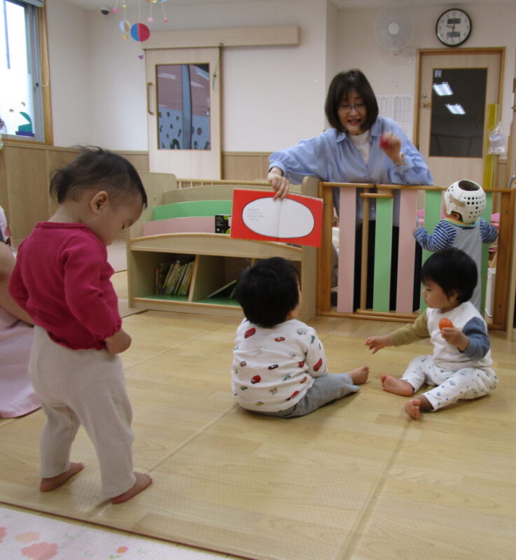 卵の絵本や歌に合わせて、音の鳴る卵のマラカスを振って楽しみました。