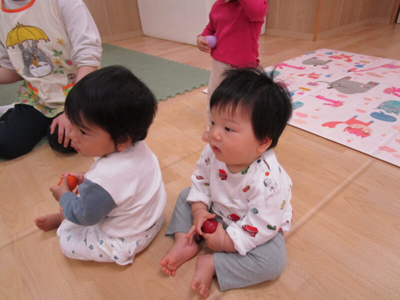 歌も楽しんでいますが、それぞれもらった卵のマラカスが嬉しくてじーっと見つめている姿もありました。