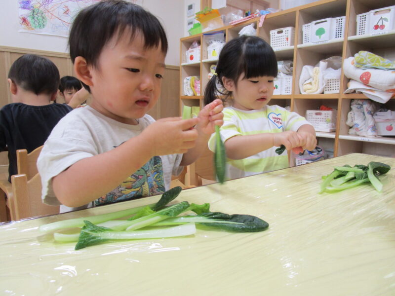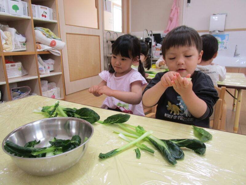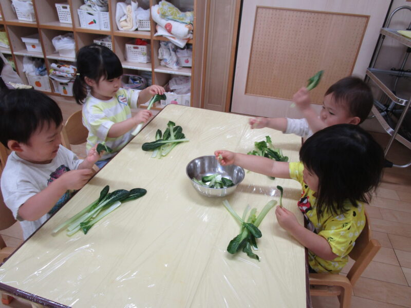 小松菜をみんなで小さく割いていきます。