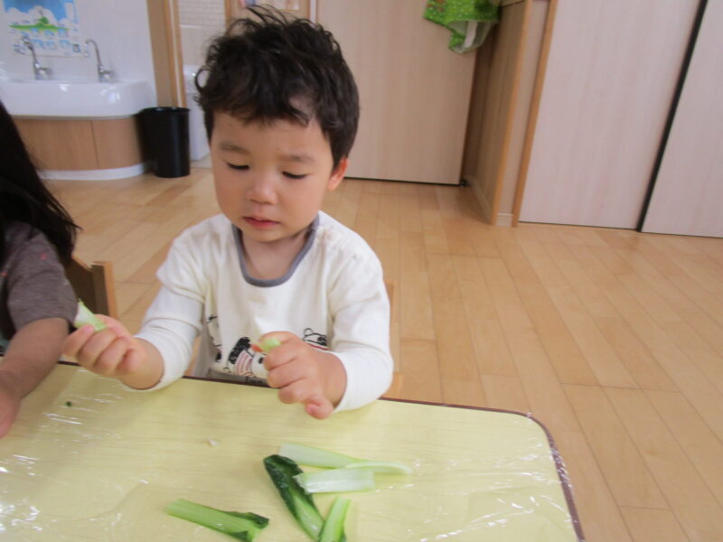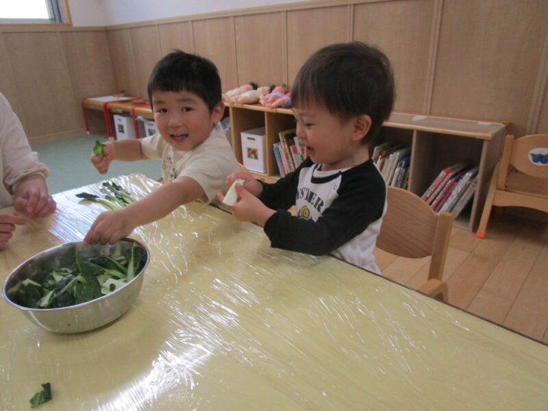 みんなで割いた小松菜は美味しくおやつで頂きました。