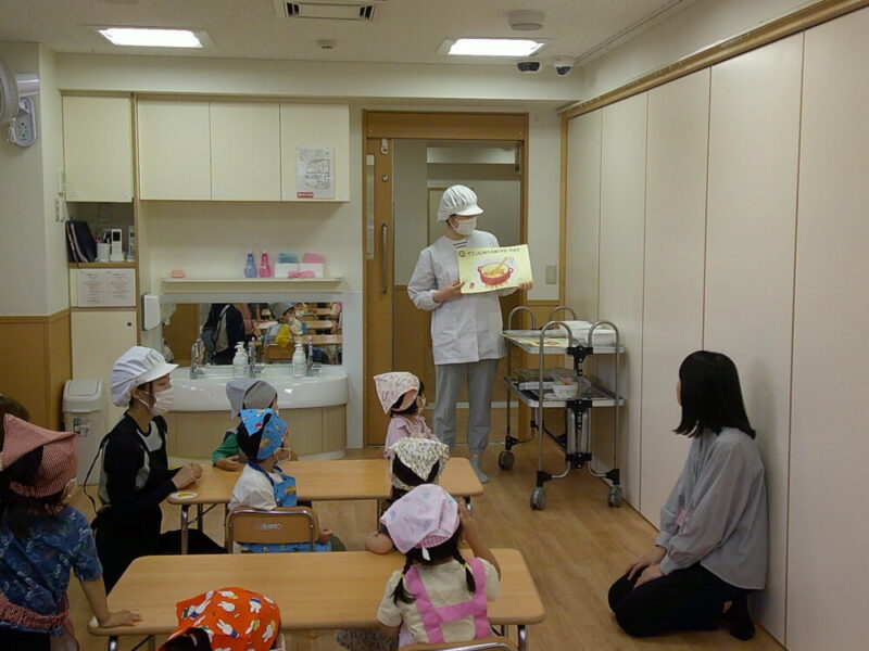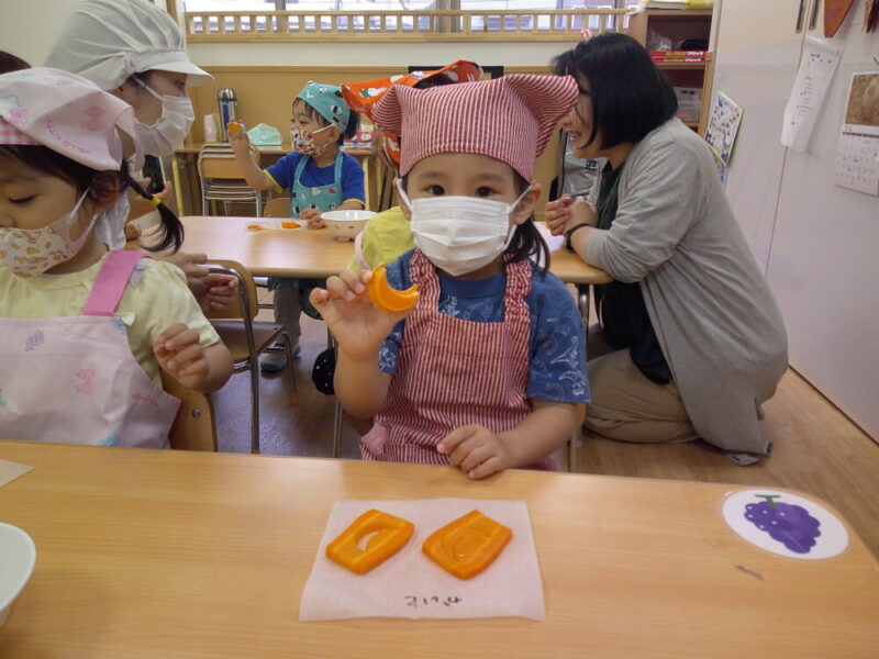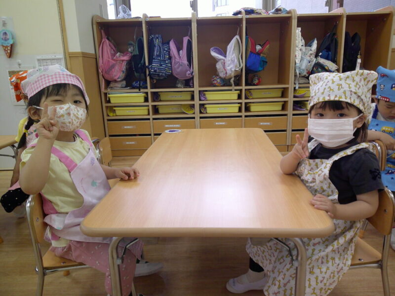 幼児クラスからはエプロン・三角巾・マスクの着用があるため、何日も前から「たのしみ~!」「早く着たい!」とワクワクが止まらない様子の子どもたちでした😊