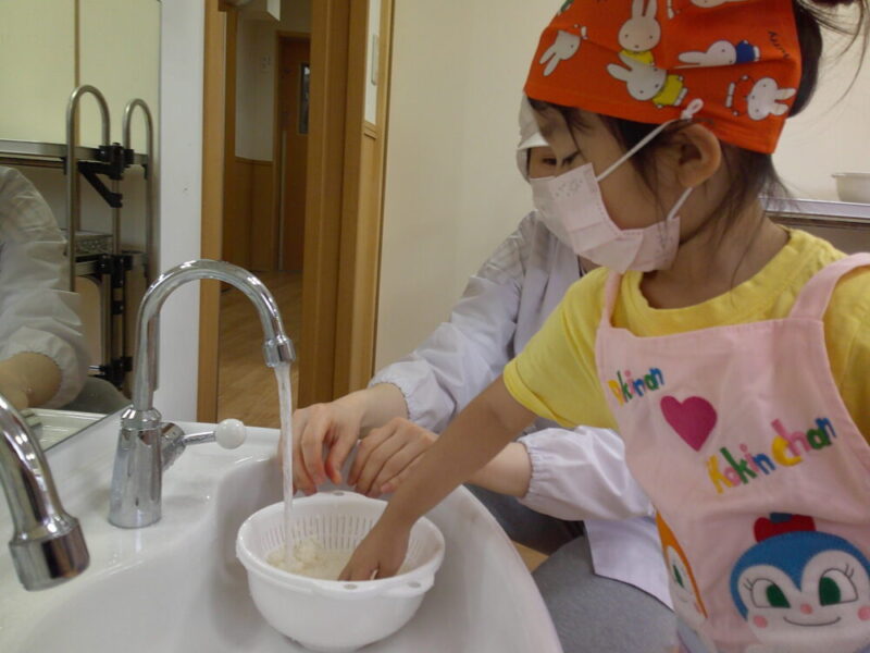3グループに分かれて、1人10回ずつ数えて交代でお米を洗いましたよ!
